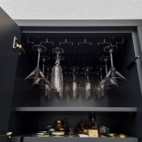 Inside unit drawers, hanging glasses rack and pull out shelves.